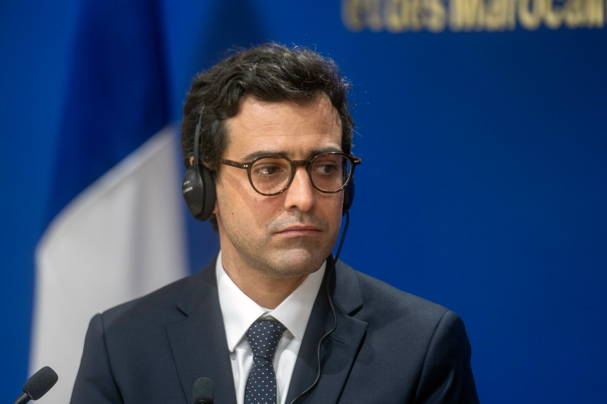 Francúzsky minister zahraničných vecí Stéphane Séjourné počas spoločnej tlačovej konferencie s jeho marockým rezortným kolegom Násirom Búrítom v Rabate v pondelok 26. februára 2024. Zdroj: FOTO TASR/AP