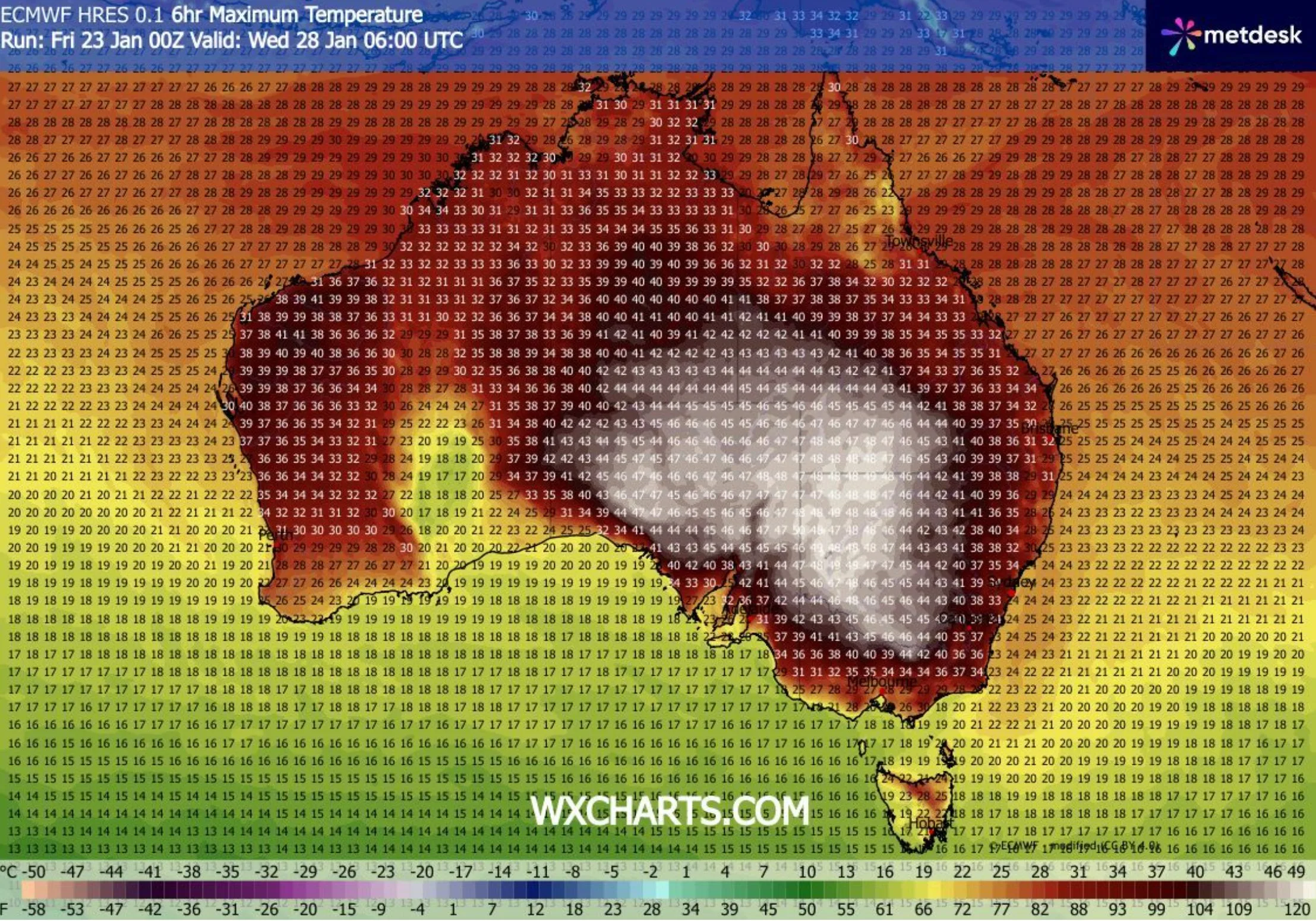 Mierne ochladenie z juhu nezasiahne jadro tepelnej kupoly skôr ako cez víkend. Dovtedy sa bude epicentrum extrémneho tepla presúvať v protismere hodinových ručičiek cez vnútrozemie: v stredu zasiahne severozápad Nového Južného Walesu (Wilcannia 48 °C), vo štvrtok severovýchod Južnej Austrálie (Marree 49 °C) a v piatok sa vráti do jej západných častí.