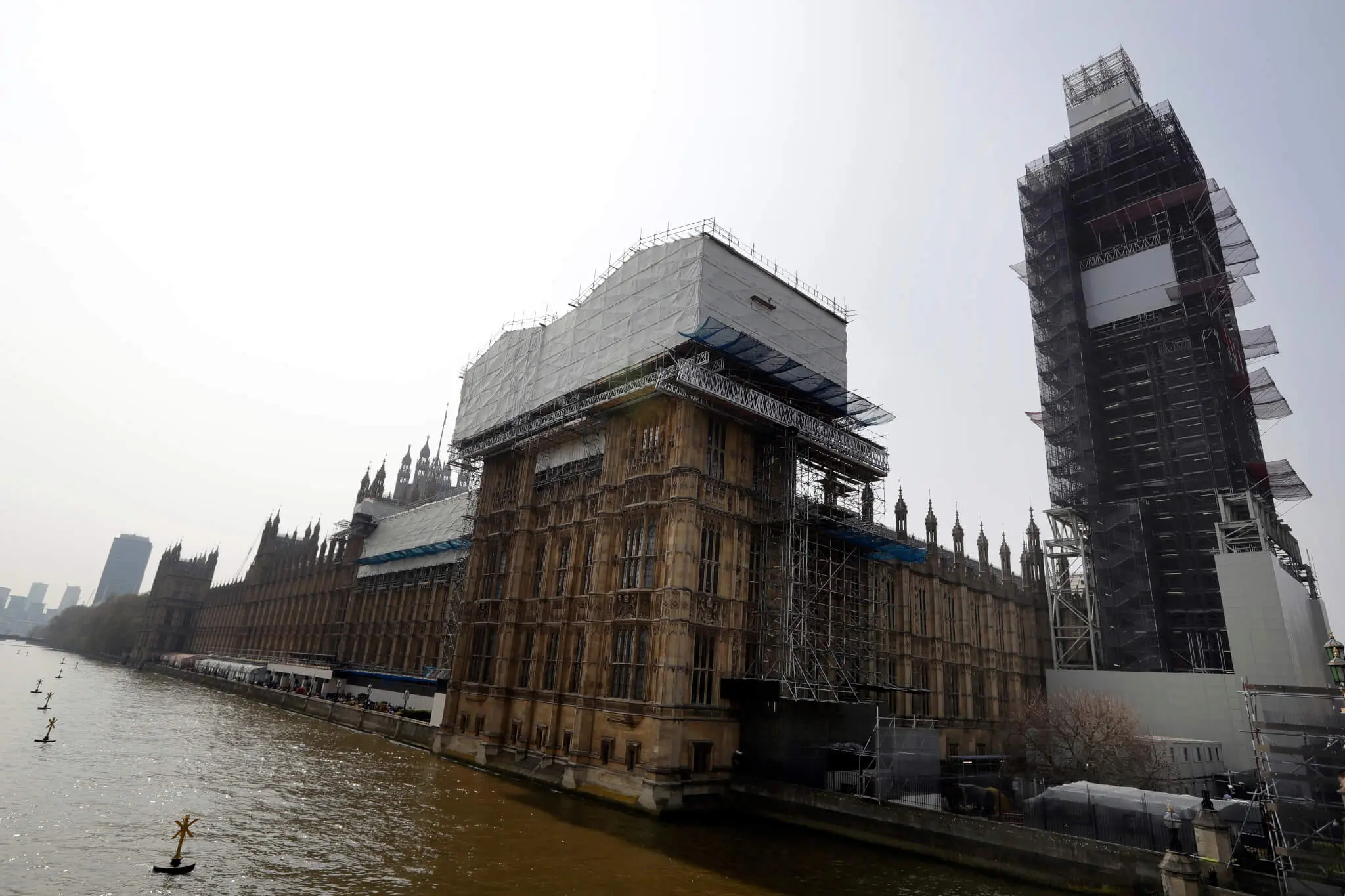 WA 54 archív Londýn - Na archívnej snímke zo 17. apríla 2019 budova britského parlamentu, ktorá je prikrytá plachtami poèas rekonštrukcie v Londýne. Budova britského parlamentu je majstrovským architektonickým dielom zapísaným na zozname Svetového dedièstva UNESCO, ktoré roène navštívi milión ¾udí. Zároveò je to rozpadajúca sa, poškodená budova plná azbestu, ktorej hrozí "reálne a rastúce" riziko znièenia, uviedli zákonodarcovia v stredu 17. mája 2023. Výbor pre verejné financie Dolnej snemovne v správe uvádza, že sídlo britskej demokracie je "netesné, opadáva z neho murivo a hrozí mu neustále nebezpeèenstvo požiaru". FOTO TASR/AP FILE - Britain's Houses of Parliament, covered in hoarding and scaffolding as it undergoes restoration work to repair the crumbling building, in London, Wednesday, April 17, 2019. British lawmakers are warning that the country's Parliament building is at “real and rising” risk of destruction. The House of Commons Public Accounts Committee said Parliament is “leaking, dropping masonry and at constant risk of fire,” as well as riddled with asbestos. The committee said Wednesday, May 17, 2023 that “there is a real and rising risk that a catastrophic event will destroy” the building before long-delayed restoration work is done. (AP Photo/Kirsty Wigglesworth, File) *** Local Caption *** plachta plachty lešenie