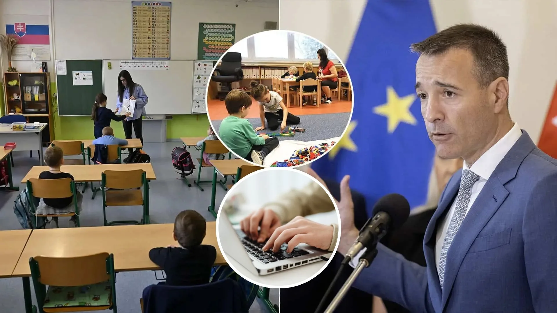 Na snímke sú ilustračné fotografie a minister školstva, výskumu, vývoja a mládeže SR Tomáš Drucker (Hlas-SD). Zdroj: FOTO TASR/Martin Baumann, FOTO TASR/Roman Hanc, FOTO TASR/František Iván, koláž: istream, Canva