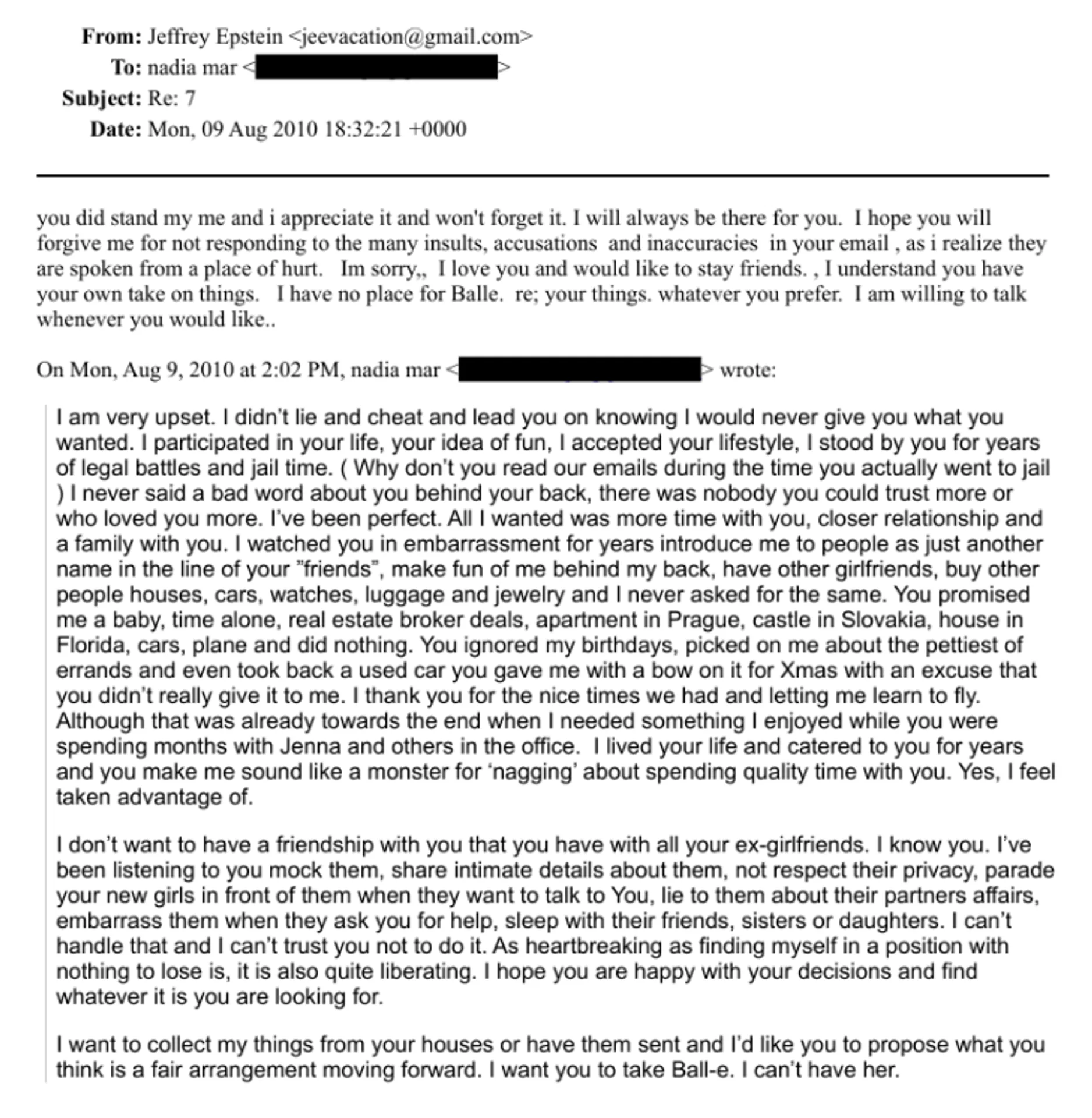 „Sľúbil si mi dieťa, čas len pre nás, obchody s nehnuteľnosťami, byt v Prahe, hrad na Slovensku, dom na Floride, autá, lietadlo a neurobil si nič. Ignoroval si moje narodeniny, šikanoval si ma kvôli najnepodstatnejším veciam a dokonca si mi vzal späť ojazdené auto, ktoré si mi dal s mašľou na Vianoce, s výhovorkou, že si mi ho vlastne nedal,“ napísala mu v emaily.