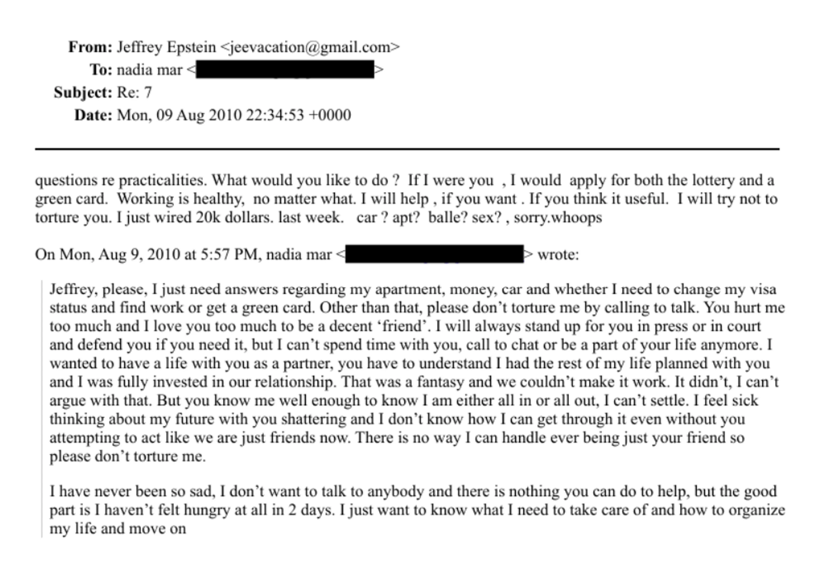 Z e-mailov vyplýva, že Epstein jej mal opakovane sľubovať spoločnú budúcnosť. Spomínajú sa prísľuby o dieťati, spoločnom živote a rôznych nehnuteľnostiach, medzi nimi byte v Prahe, dome na Floride či dokonca hrade na Slovensku.