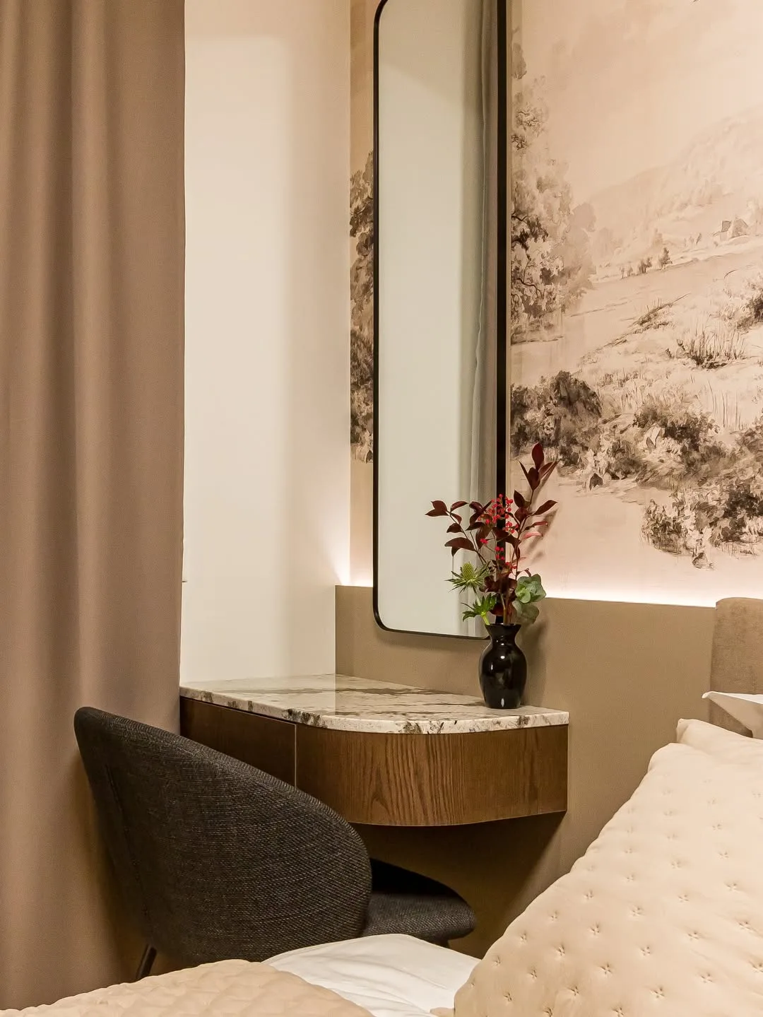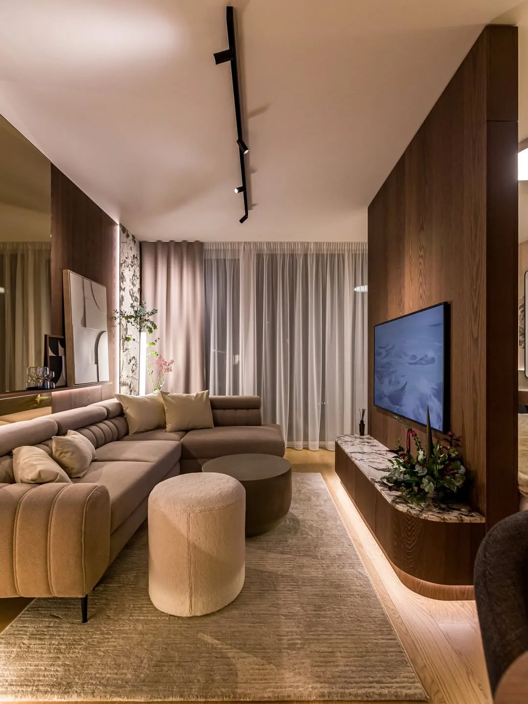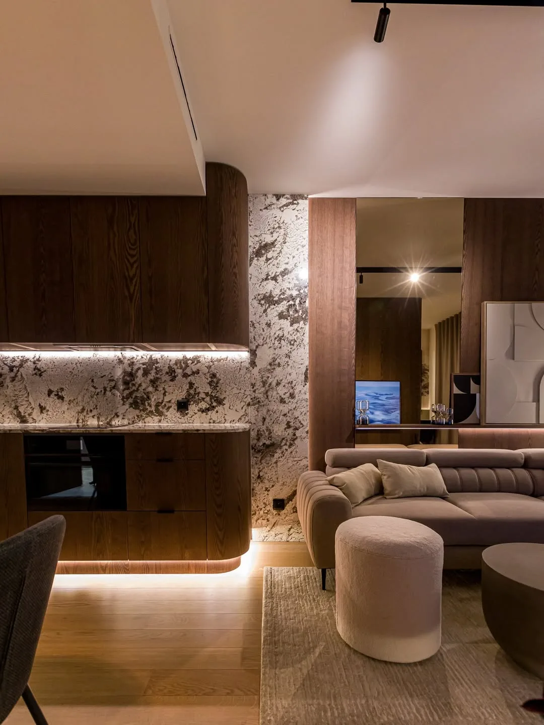 Materiály použité v byte sú starostlivo vyberané a kombinujú drevo, kameň, jemnú kresbu mramoru a kvalitné textílie. Táto kombinácia vytvára dojem luxusu, ktorý je zároveň pohodlný a príjemný na bývanie. Povrchy, či už lesklé alebo matné, sú vyvážené tak, aby interiér nepôsobil chladne alebo preplnene. Ruka skúseného dizajnéra je viditeľná v každom detaile, od vrstveného osvetlenia cez skryté LED pásy až po nábytok na mieru. Jemné krivky, zaoblené tvary a mäkké textílie, ktoré sú dnes veľmi populárne, premieňajú obyčajný byt na útulný a štýlový domov.