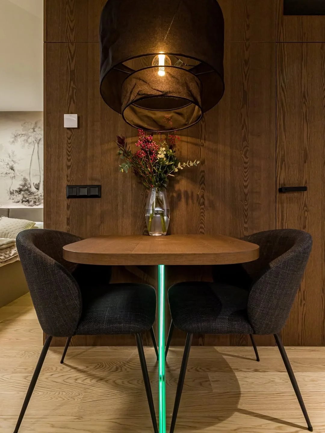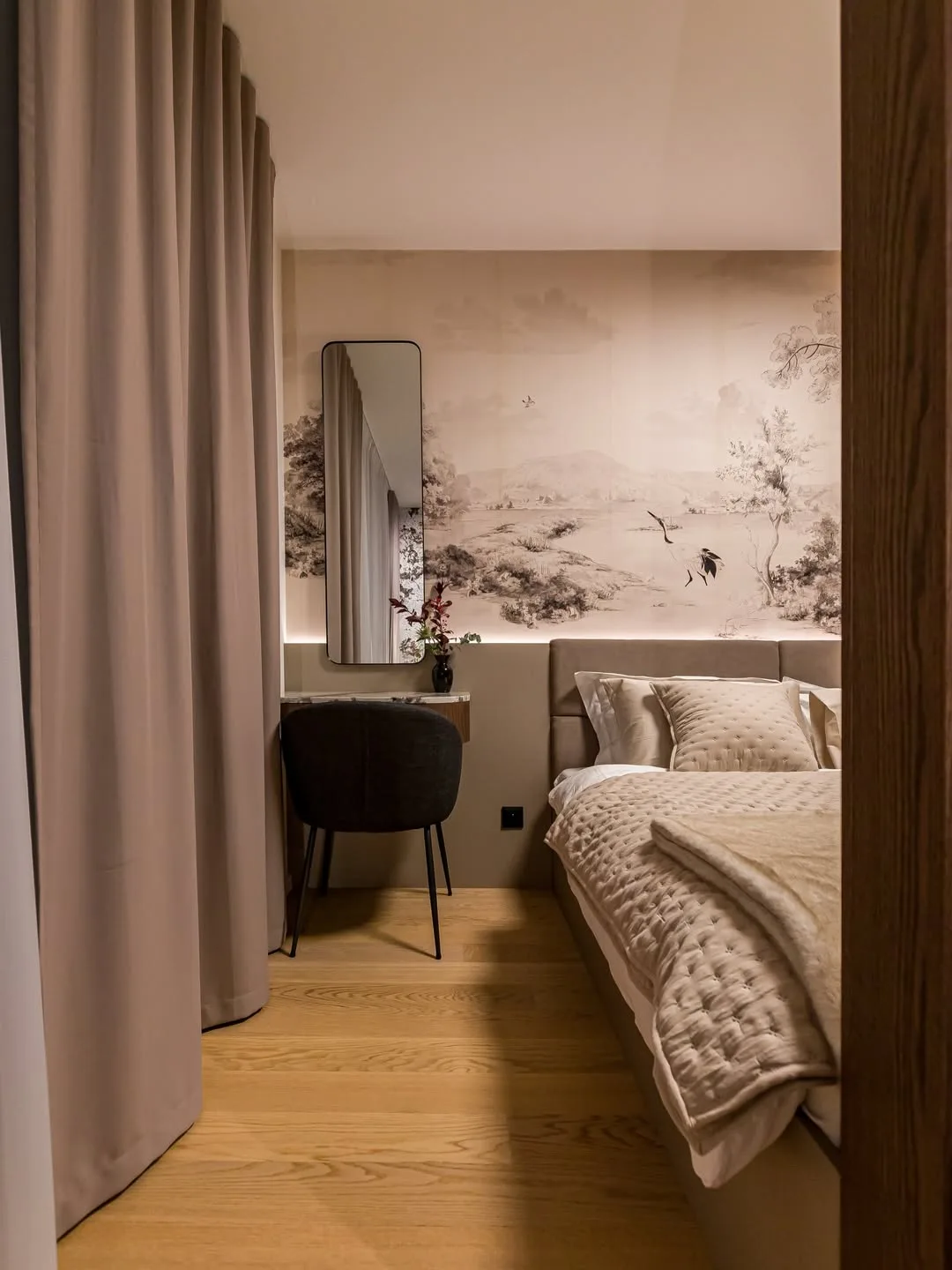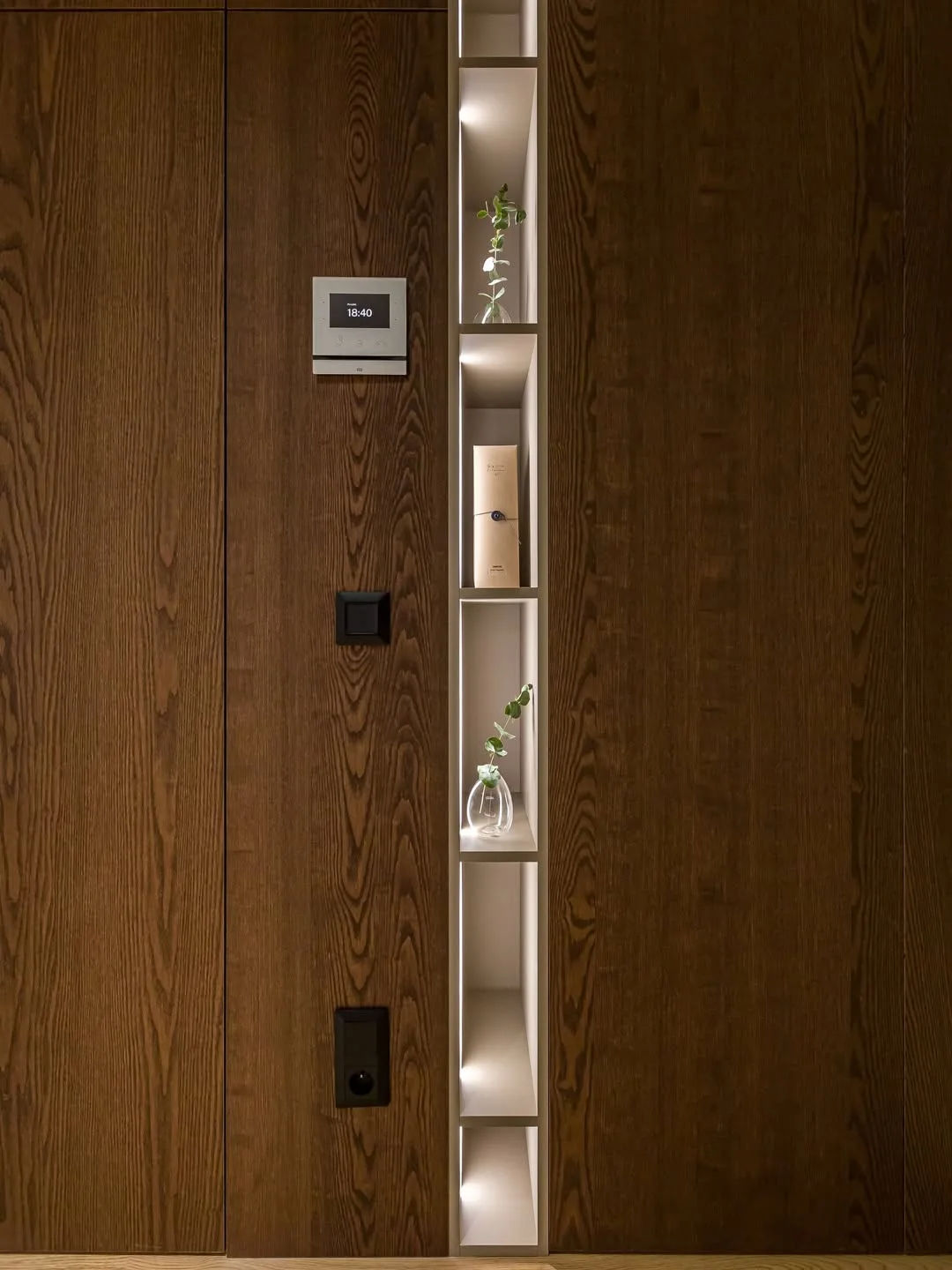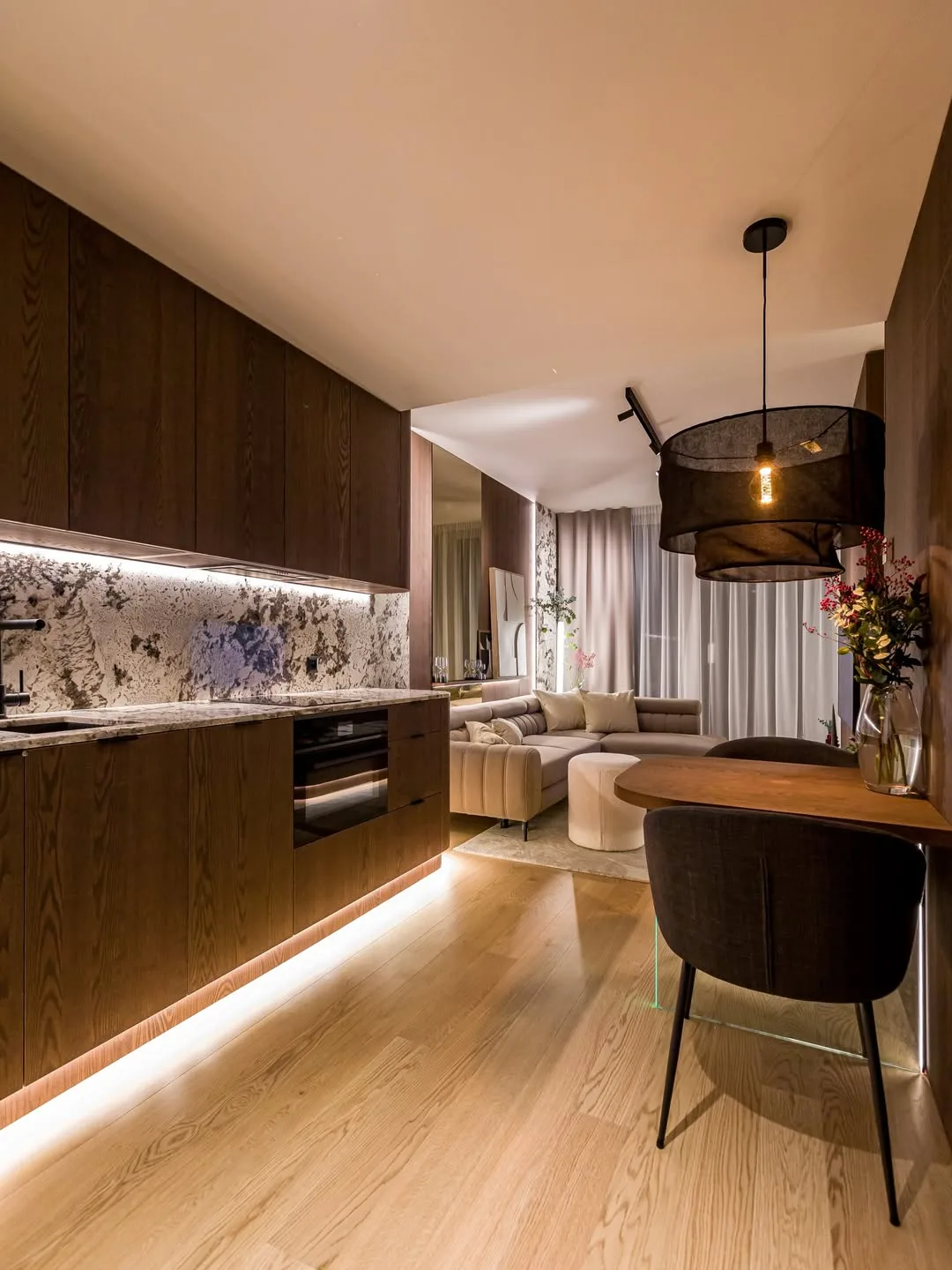 V priestore sa dá pozorovať dôraz na funkčnosť bez kompromisov na estetike. Vrstvené osvetlenie, optické prepojenie miestností a úložné riešenia na mieru udržiavajú čistotu a poriadok, pričom interiér pôsobí nadčasovo a elegantne. Kvalitné spracovanie detailov, precízne prechody materiálov a premyslené kombinovanie textúr dodávajú bytu hĺbku a charakter. Zároveň je miesto navrhnuté tak, aby bolo plne využiteľné pre každodenný život a pohodlie jeho obyvateľov.