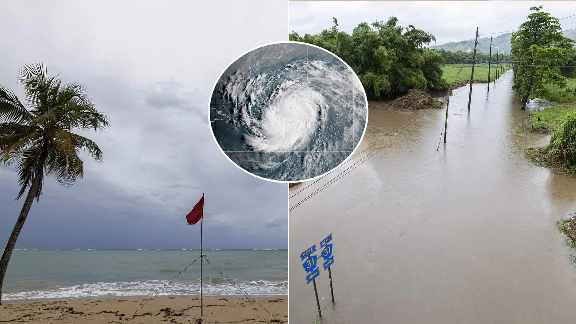 Červená zástava varuje pred nebezpečnými vlnami na prázdnej pláži v meste San Juan, v Portoriku 17. augusta 2025 po tom, ako sa sa touto oblasťou prehnal hurikán Erin. Zdroj: FOTO TASR/AP