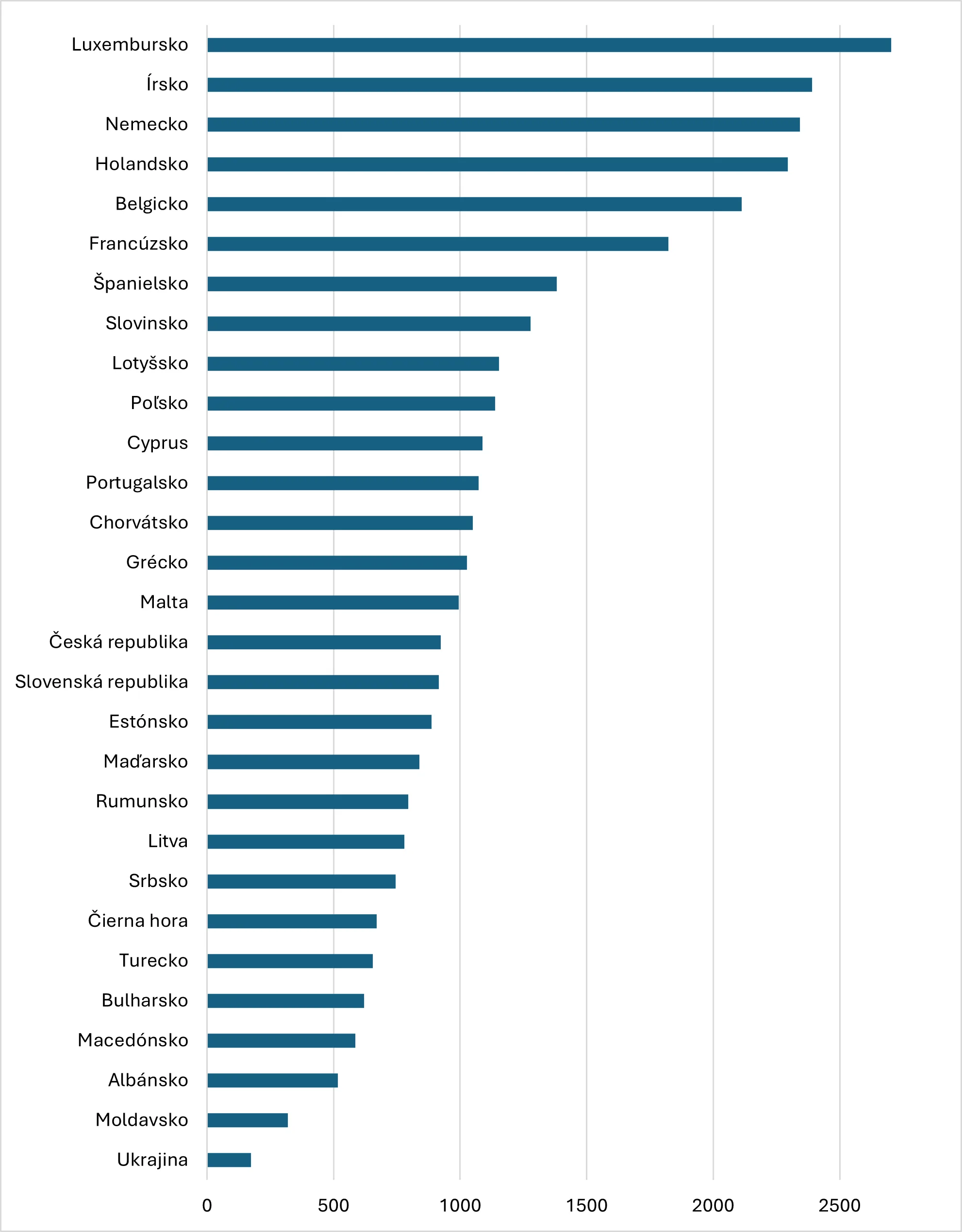 V kontraste k bohatým krajinám sú na opačnom chvoste rebríčka Ukrajina (173 €), Moldavsko, Albánsko, Macedónsko a Bulharsko.