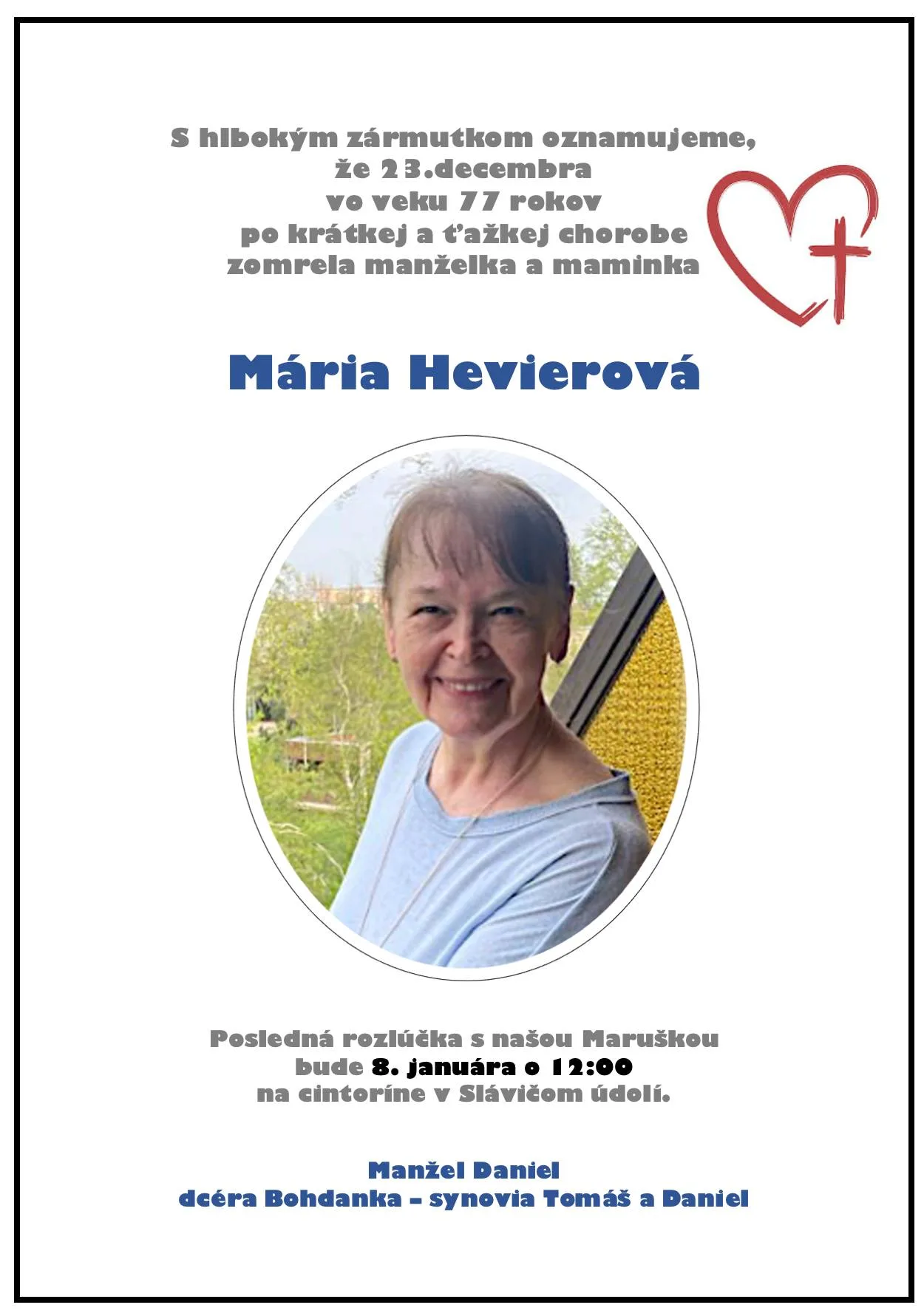 Ako sme informovali, spisovateľ Daniel Hevier prišiel len deň pred Štedrým dňom o milovanú polovičku. V utorok (23. 12.) vo veku 77 rokov zomrela po krátkej a ťažkej chorobe rozhlasová redaktorka a prekladateľka Mária Hevierová.