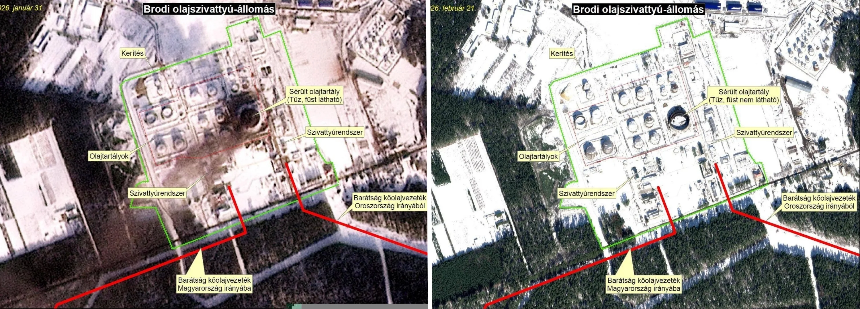 Na snímke z 31. januára (vľavo) vidieť stúpajúci dym z poškodeného ropovodu, zatiaľ čo 21. februára (vpravo) nie je vidieť žiaden dym. To tvrdí premiér Viktor Orbán na základe satelitných záberov.