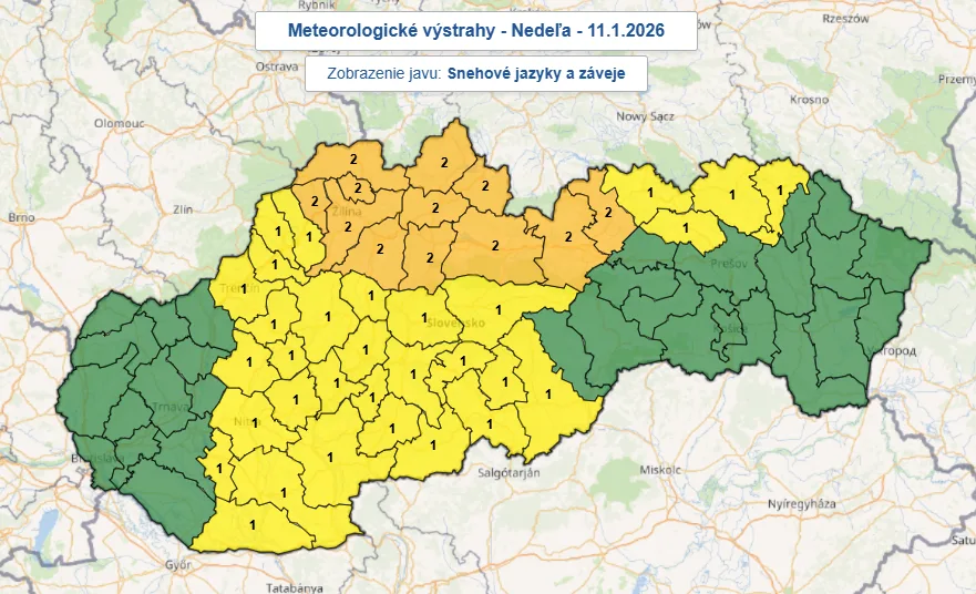 Na juhu sa môže prechodne aj zmenšiť oblačnosť a tu sa zrážky vyskytnú len lokálne. Vplyvom vetra nie je vylúčená ani tvorba snehových jazykov a závejov, v severných lokalitách platí až 2. stupeň výstrah. Zostáva veľmi chladno a miestami veterno.