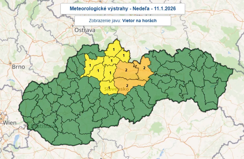 V horských oblastiach platia výstrahy 1. a 2. stupňa, pričom pri vyššom stupni sa v polohách nad približne 1 800 metrov ojedinele očakáva výskyt silného vetra, „ktorý dosiahne krátkodobo (v nárazoch) rýchlosť 38 – 44 m/s (135 – 160 km/h) a/alebo priemernú rýchlosť 25 – 29 m/s (90 – 105 km/h), t.j. silná až mohutná víchrica“.