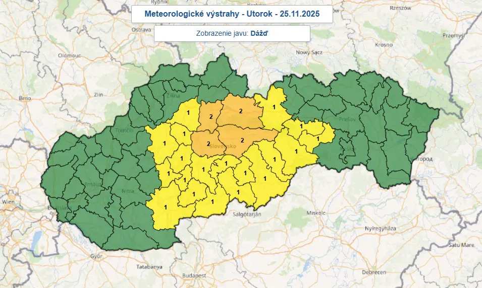 Meteorológovia ale varujú pred výdatným dažďom, ktorý zasiahne najmä stred Slovenska. Do stredajšieho (26. 11.) poludnia je v platnosti výstraha 1. stupňa, kedy sa očakávajú celkové úhrny dažďa od 50 do 70 mm, v prípade 2. stupňa výstrah môže lokálne spadnúť 80 mm.