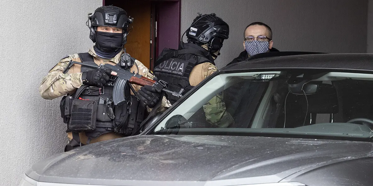 Na snímke obvinený bývalý riaditeľ SIS Vladimír Pčolinský, ktorého privážajú na Špecializovaný trestný súd (ŠTS) v Pezinku v nedeľu 14. marca 2021. Zdroj: FOTO TASR/Jaroslav Novák