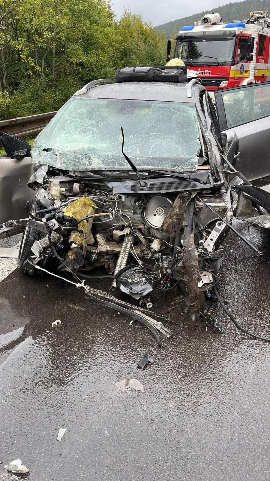 Zranenia u troch ľudí si vyžiadala pondelková (6. 10.) popoludňajšia dopravná nehoda na ceste I/11 v Krásne nad Kysucou. Foto: Facebook/Hasičský a záchranný zbor – Žilinský kraj