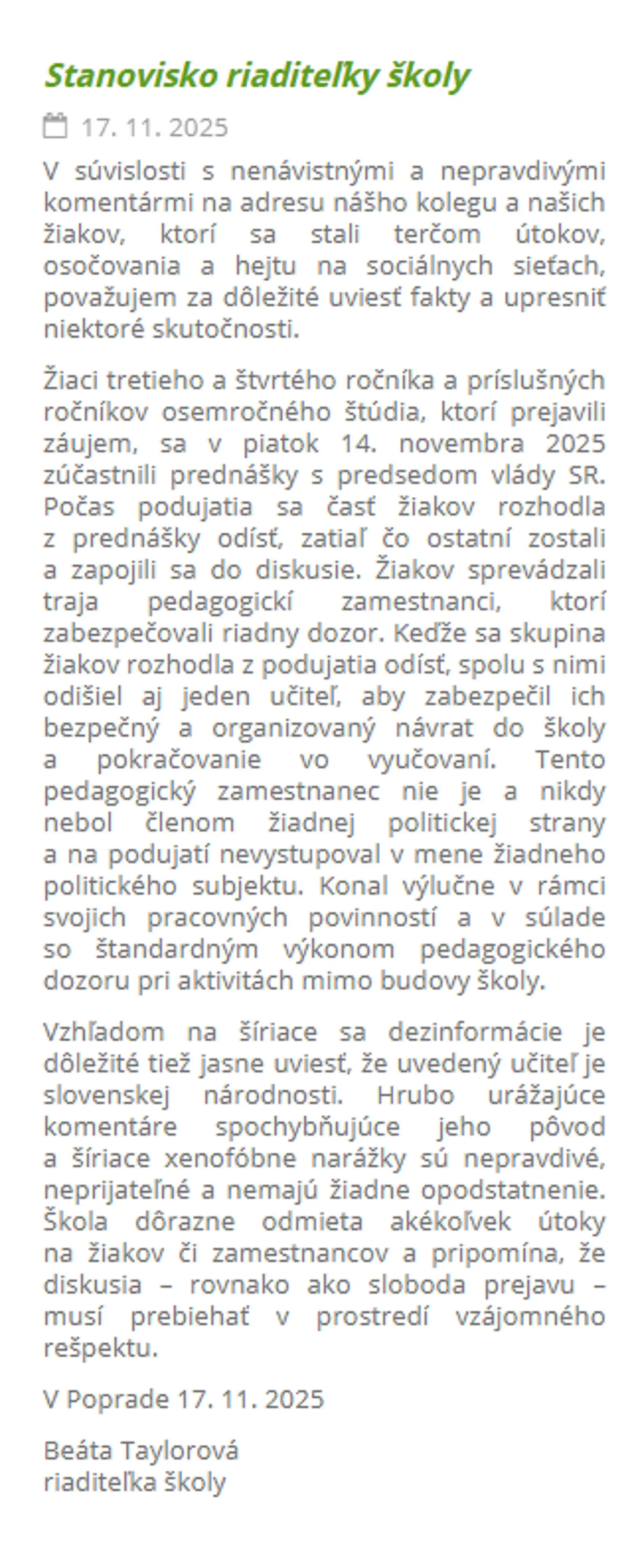 „Vzhľadom na šíriace sa dezinformácie je dôležité tiež jasne uviesť, že uvedený učiteľ je slovenskej národnosti,“ dodala riaditeľka.