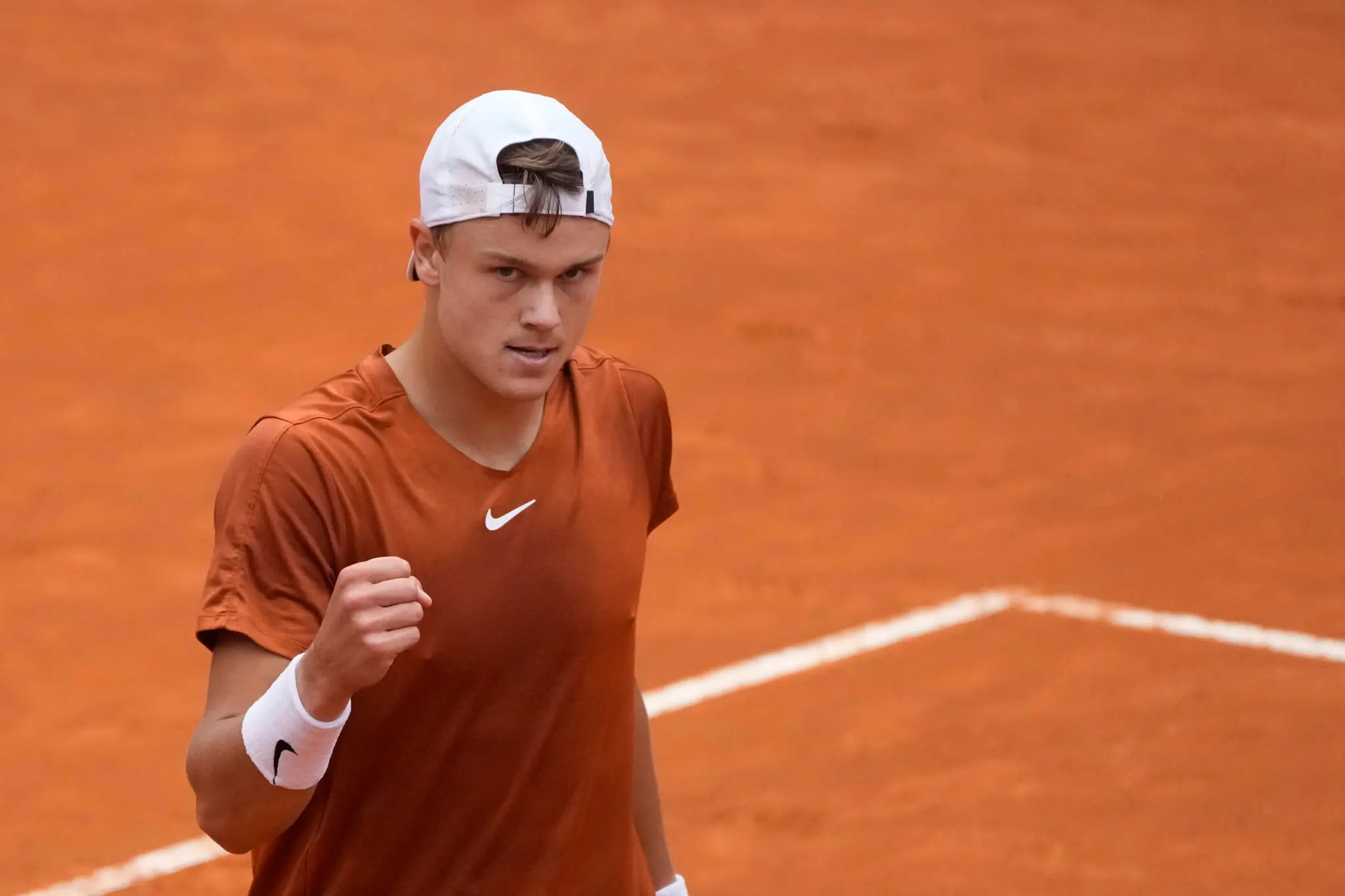 Denmark’s Holger Rune celebrates after winning a semi final match against Norway’s Casper Ruud at the Italian Open tennis tournament in Rome, Italy, Saturday, May 20, 2023. (AP Photo/Gregorio Borgia)