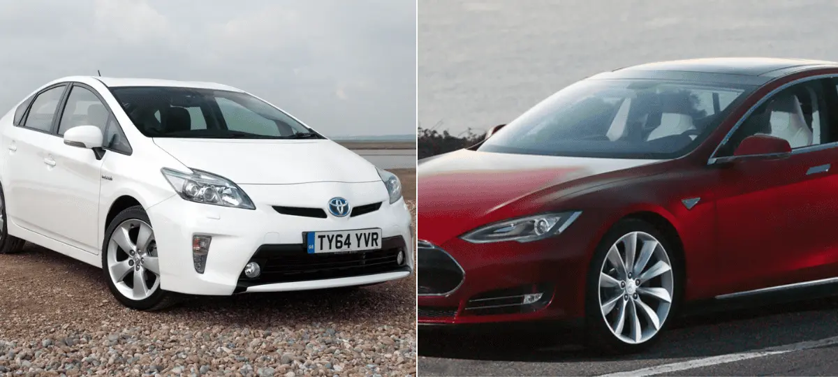 Toyota Prius, Tesla model S. Zdroj: toyota-media.co.uk, Wikipedia