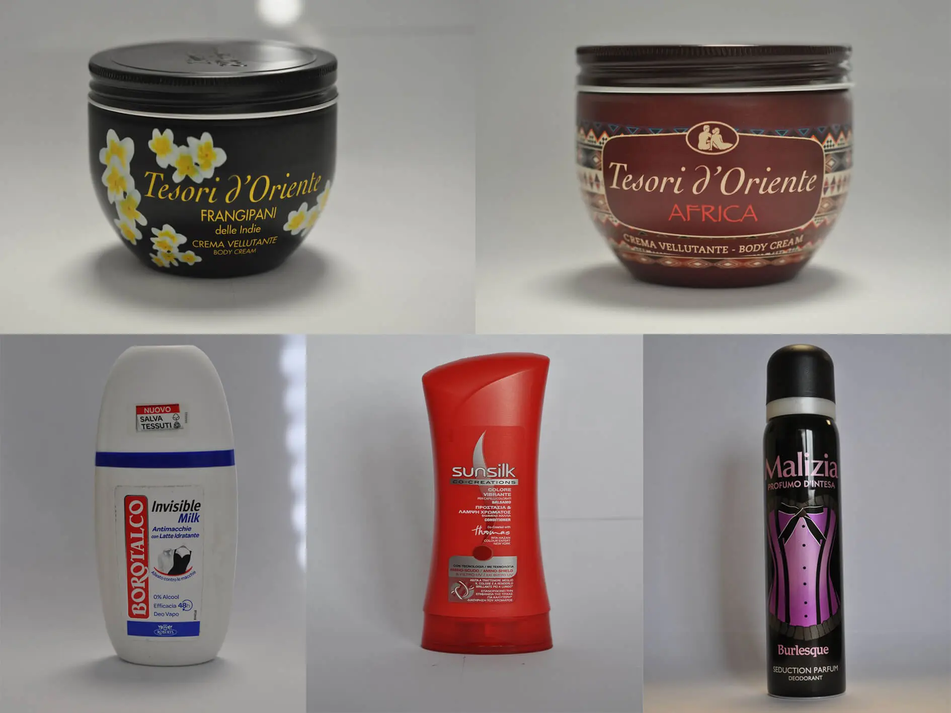 Rovnako kondicionér na vlasy značky Sunsilk, sprejový dezodorant Adidas – Control ultra protection, toaletná voda Fair Fight, parfumovaná voda OMD! A heavenly Perfume, sprejový dezodorant Borotalco – invisible fresh, parfumovaná voda Angelina, sprejové dezodoranty Malizia profu mod‘ intesa či parfumovaná voda Sexxy – shoo. Ale tiež parfumovaná voda Wealth, parfum Pure Temptation, penové tužidlo na vlasy Fiber Flex značky Schwarzkopf, kozmetická súprava Eau my din či sprejový dezodorant Dermomed deodorante.