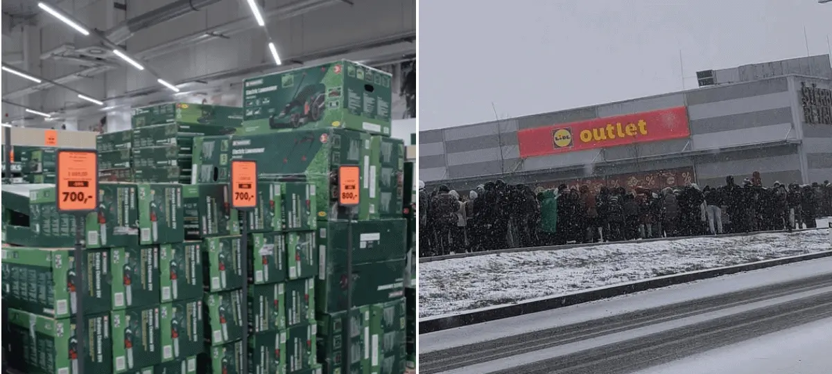 Predajňa Lidl Outlet v pražských Štěrboholiach spôsobila hotový ošiaľ. Ľudia stoja v dlhých radoch už hodinu pred otvorením. Foto: Facebook/Jakub L., reprofoto/Facebook/Lidl Česká republika