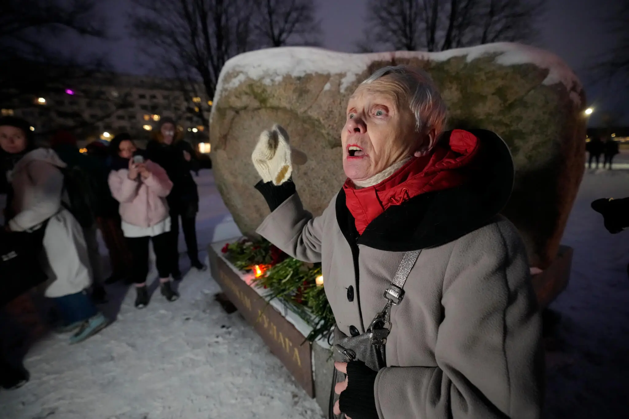 Osemdesiattriročná žena sa prihovára ľuďom, ktorí kladú kvety k pamätníku, veľkému balvanovi zo Sloveckých ostrovov v Bielom mori, kde bol zriadený prvý gulag pre politických väzňov na pamiatku zosnulého väzneného ruského opozičného politika Alexeja Navaľného v Moskve v piatok 16. februára 2024. O úmrtí neochvejného kritika ruského prezidenta Vladimira Putina v trestaneckej kolónii za polárnym kruhom informovala v piatok ruská väzenská služba. Po vychádzke mu údajne prišlo nevoľno a stratil vedomie. Väzenským zdravotníkom ani privolanej záchrannej službe sa ho už vraj nepodarilo oživiť. Príčina úmrtia podľa vyhlásenia väzenskej služby nie je bezprostredne známa. Zdroj: FOTO TASR/AP