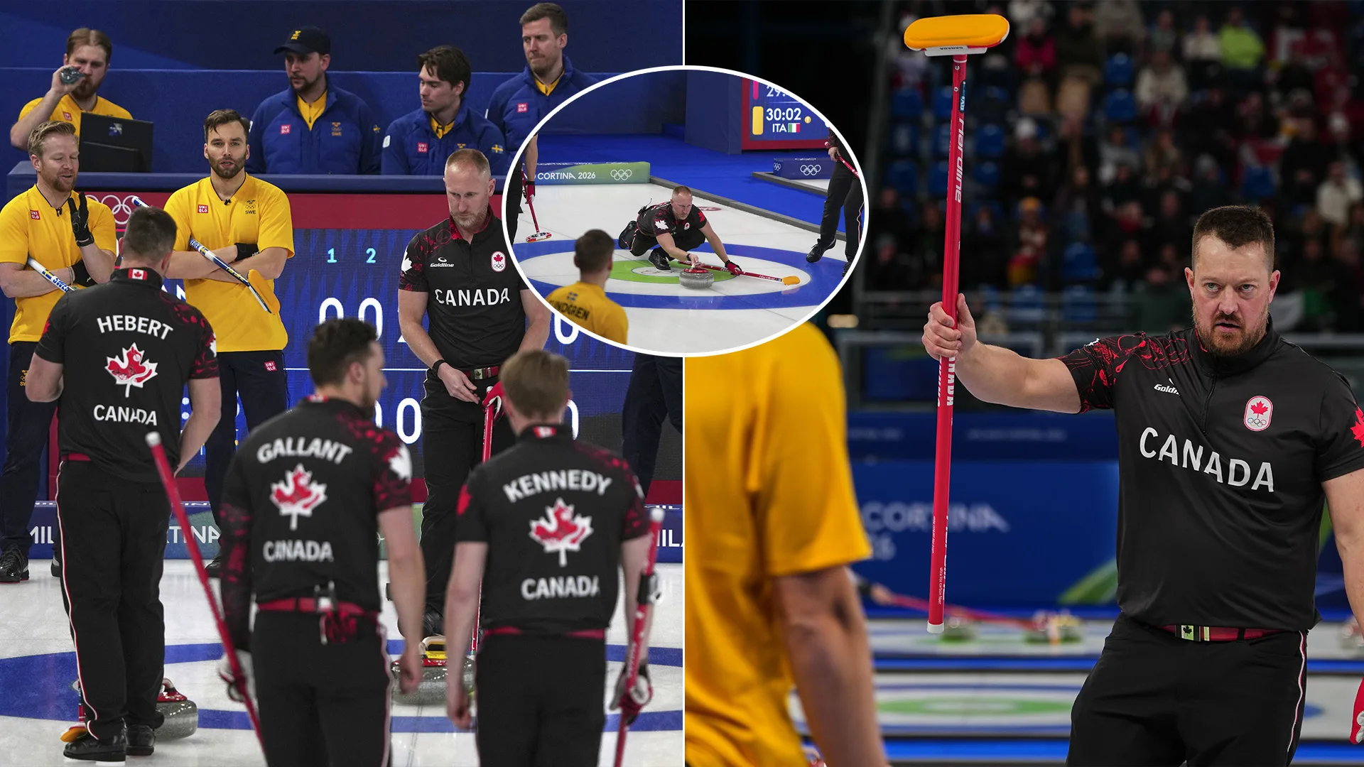 Na snímke sú Kanaďania a Švédi počas mužského curlingového turnaja na zimných olympijských hrách 2026 v Cortine d'Ampezzo v Taliansku, piatok 13. februára 2026. Zdroj: TASR/AP/Misper Apawu, koláž: istream