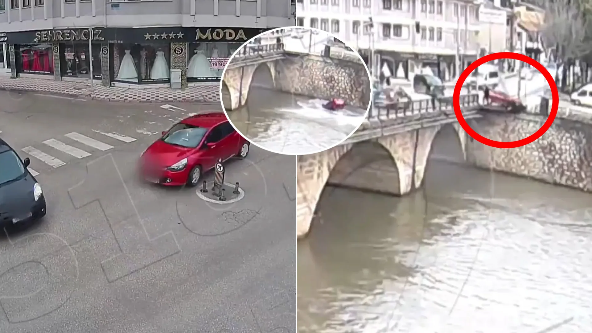 Celý incident zaznamenali kamery mestského bezpečnostného systému (KGYS). Na záberoch je vidieť okamih zrážky na križovatke, následné prerazenie zábradlia a dramatický pád auta do rieky.