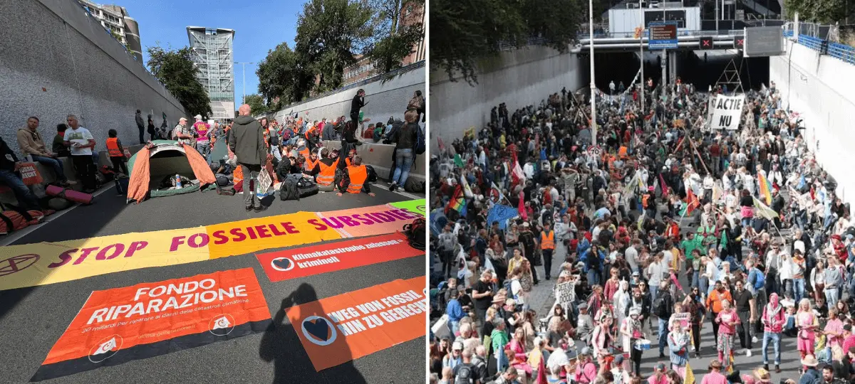 Klimatickí aktivisti protestovali v sprievode bubnov, pričom niesli transparenty so sloganmi „konajte ihneď“, „zastavte dotácie na fosílne palivá“ alebo „problémom je ekonomický rast“. Reuters píše, že niektorí z protestujúcich si priniesli aj kempingové stoličky, na vozovke si rozložili stany a plánujú tam prenocovať.