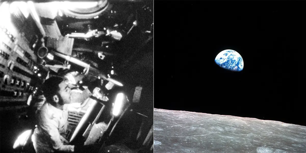 Na archívnej snímke z decembra 1968 vľavo William Anders, pilot lunárneho modulu Apollo 8, sa pozerá z okna počas letu do vesmíru a napravo Zem vychádza nad mesačný horizont počas misie posádky Apolla 8. Zdroj: FOTO TASR/AP