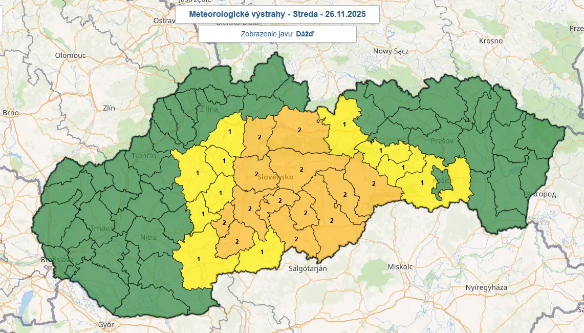 Meteorológovia zároveň vydali výstrahy pred dažďom. Výstrahy druhého stupňa platia pre väčšinu Banskobystrického kraja a okresy Rožňava, Liptovský Mikuláš a Ružomberok. Spadnúť tam môže viac ako 50 mm zrážok.