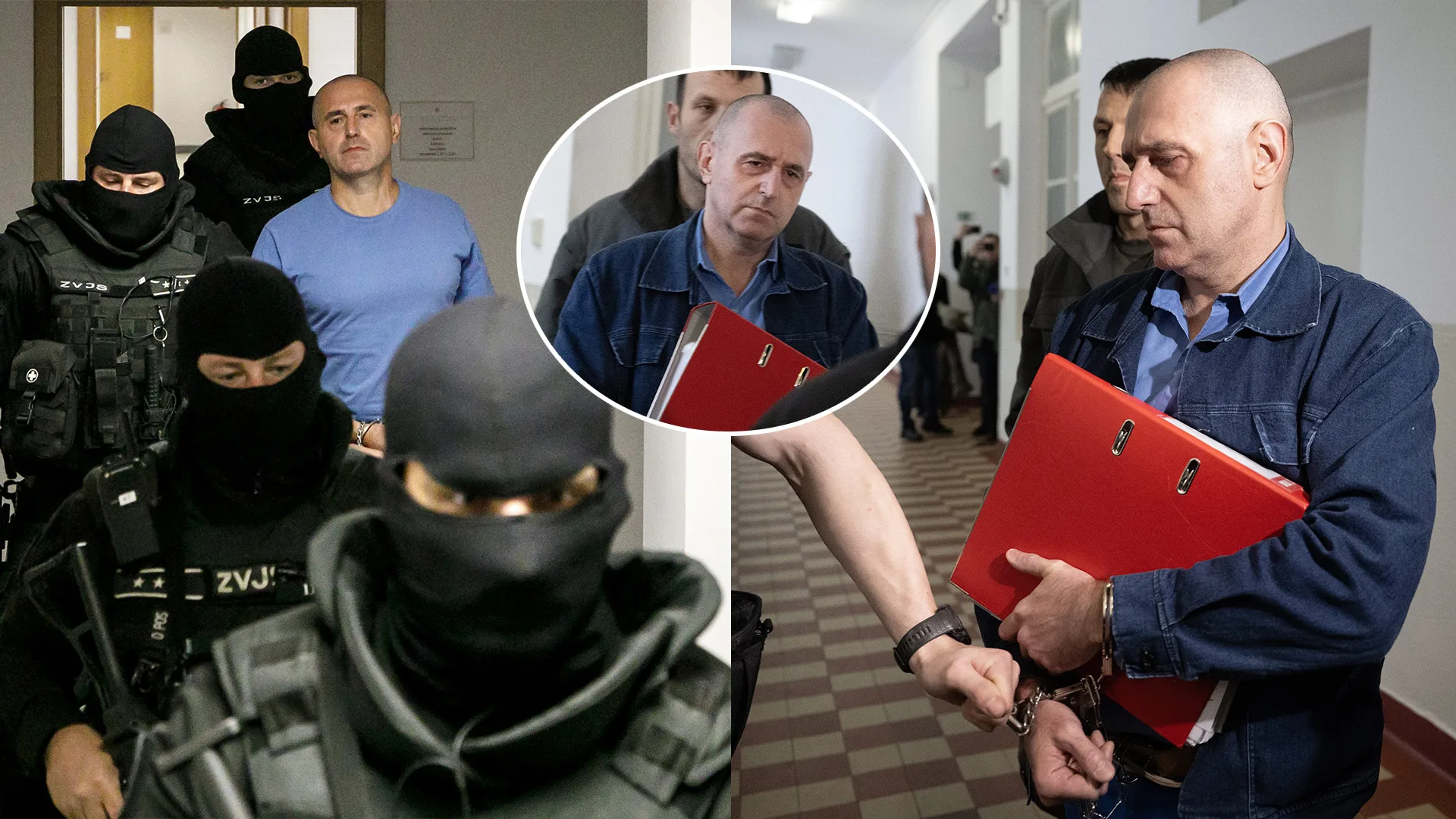 Obvineného Jozefa Radiča eskortovali príslušníci Zboru väzenskej a justičnej stráže po pojednávaní na Najvyššom súde SR v Bratislave 9. augusta 2023. Na snímke uprostred Jozef Radič prichádza v sprievode justičnej stráže na pojednávanie v prípade vraždy Ernesta Valka 13. januára 2026 v Bratislave. Zdroj: FOTO TASR/Dano Veselský, FOTO TASR/Pavel Neubauer, koláž: istream