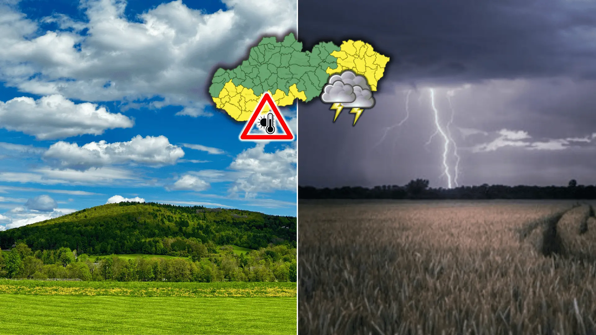 Výstraha 1. stupňa pre juh západného a sčasti stredného Slovenska pred vysokými teplotami a výstraha 1. stupňa pre východnú časť krajiny pred búrkami na 14. júla 2025. Foto: reprofoto/shmu.sk