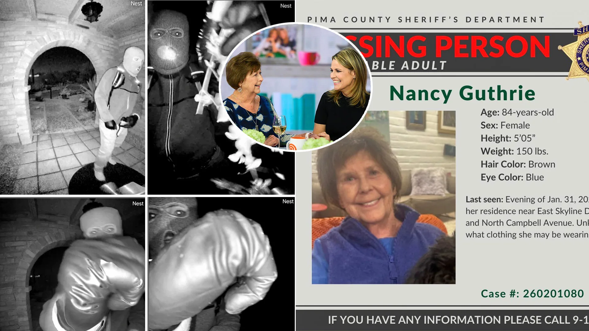 Na snímke je páchateľ u domu Nancy Guthrieovej. Uprostred je nezvestná žena spolu so svojou dcérou, známou moderátorkou Savannah Guthrieovou. Zdroj: TASR/AP/FBI, TASR/AP/Oddelenie šerifa okresu Pima, FOTO TASR/AP, koláž: istream